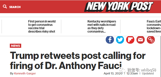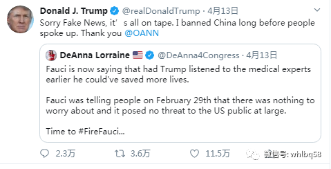 特朗普当即就转发了洛林的这条推特,并写道:“对不起,假新闻(意为福西是讲假话)”还写道:“我在人们大声疾呼之前就禁止了中国(病毒的传入)”