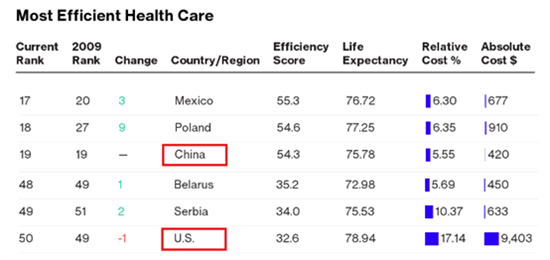 (2)低效率:彭博社2014年发布的各国医疗体系效率的排名中,全球55个被调查国家,美国的医疗系统价高质次,效率排名几乎垫底,排名第50位。中国则排19位。