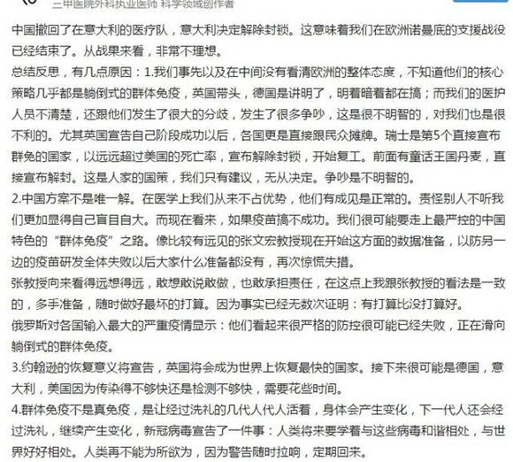 还有标明身份为执业医师的意见人士据此反思说,仿照中国方式的意大利在欧洲宛如异类,抗疫效果也不见佳,中国在不熟悉别国国情的情况下贸然推广经验不明智,群体免疫才是更适合欧美国家的方式。