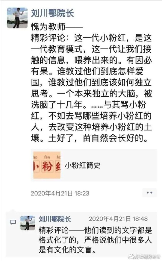 所以单独拿出新闻学院的问题作为重点,是因为要解决媒体的问题,就要先从培养媒体人的新闻学院入手,先从新闻学院院长的人选入手,其实是新闻学院的教育塑造着多数媒体人的三观。这次湖北大学能够决定成立调查组调查梁艳萍,开了一个好头。不管湖北大学在做这个决定时,有过多少阻力,中间还半夜发声明接着又删除,但总归是朝着正确方向迈出了第一步。在这次方方日记事件中,还有一些梁艳萍这样的人暴露出来。其他学校是不是也应该重视一下?各级教育主管部门是不是都应该重视起来?从国家和社会长远发展计,承担着教书育人之责的教育出问题是后果最严重的。老师向学生灌输恨国的思想,这比普通的违法犯罪行为,社会危害性更大,更不可原谅。那个去了美国幡然醒悟的乔木教授,就告诉我们,美国的教育是多么的重视爱国主义教育,孩子们从很小就要一周五天向美国国旗敬礼并宣誓爱美国,也没见哪个中国的恨国党批评过美国这种说法。说白了,他们不是反对爱国主义教育,而是反对教育学生热爱中国,不反对爱美国的教育。支持方方的人,遍布媒体、教育、文艺界,不是三观一致的人,不会在这个时候支持她。而且,这些人比较普遍的有一个特点:就是在恨国的同时,还是“国粉”,都无比怀念那个积贫积弱、战争不断、遭外地入略、民不聊生的民国。比如那个正在辛苦删除微博的杨骏:
