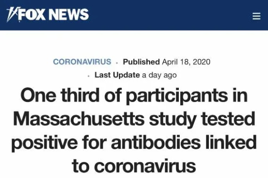 美国福克斯电视台消息:马萨诸塞州一个4万人小镇的街头随机检测后发现,200名无症状、未接受核酸检测的居民中有64人体内存在抗体,占总数将近三分之一。也就是说,随便抓三个人检测,就有一个感染。而且这些人没表现出任何症状。