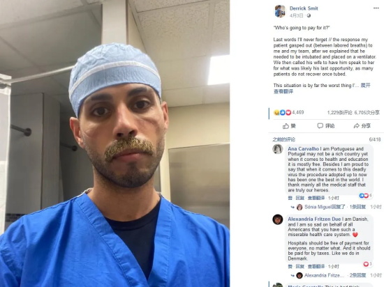 史密斯,美国纽约市麻醉科护士,他在社交媒体上公开了这一幕:生命垂危新冠肺炎患者,呼吸机是他唯一的希望,高昂费用却成了压垮他生命的最后一根稻草。弥留之际,病人绝望问道:who’s going to pay for it(账单怎么办)?