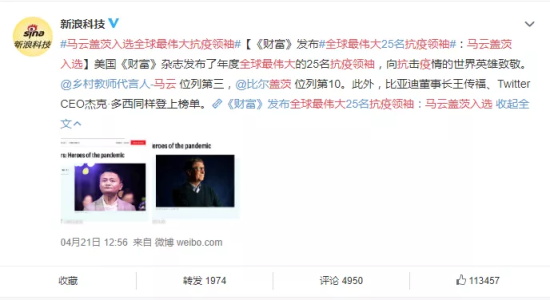 4月21日,马云被《财富》杂志评为全球最伟大的25名抗疫领袖之一。
