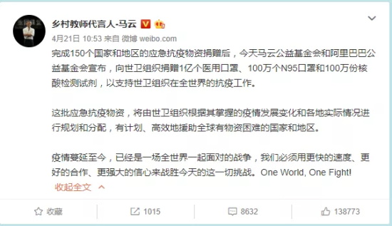 继宣布要向非洲捐赠第三批救援物质后,马云又通过社交账号宣布,向世卫组织捐赠1亿件应急抗疫物资,包括1亿个医用口罩,100万个N95口罩、100万份核酸检测试剂等。