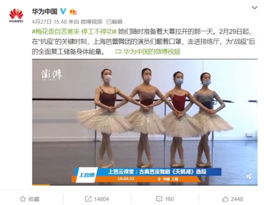 华为表示,将在支付上海芭蕾舞团版权费用后,将视频字幕翻译为十几种语言,用社交媒体的方式进行公益传播。“我们希望将‘口罩芭蕾’的奋斗之美,传递给华为在170多个国家的员工和家属、客户、合作伙伴等,激励大家以积极心态面对当前的挑战。”