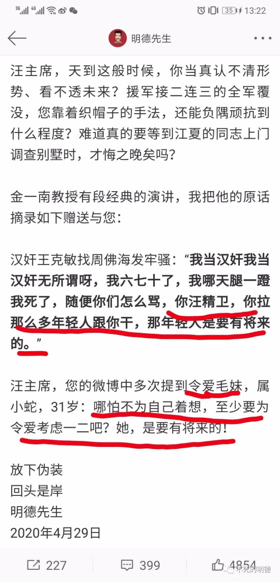 汪主席,要不是看你年纪大,还算一个长辈,我早就把作协朋友给我的那一大头书的材料全砸你脸上了,之所以克制再克制,忍让再忍让,包括围点打援,也只是打退那些鼓励你在错误路上越走越远的人,目的只有一个,希望你回头是岸!