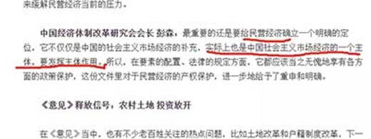 但,我们明明没有看到中*央在这份《意见》中有任何关于“民营经济主体地位”的说法,这无疑是彭会长个人的一厢情愿。