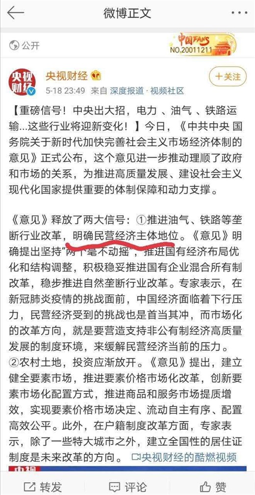 在这篇评论性的微博中,@央视财经竟然史无前例的在主流媒体上公开提出并对中*央文件断章取义式的提炼出“明确民营经济主体地位”的说法!