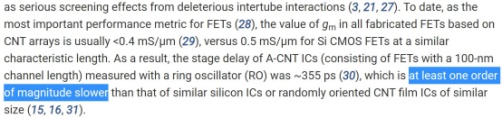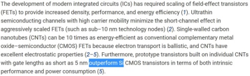 在此之前,碳纳米管晶体管的性能总是比硅差至少一个量级