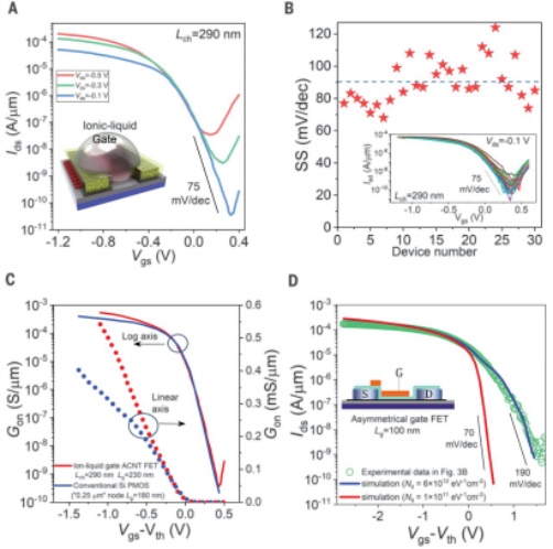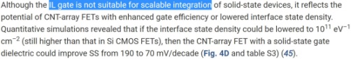 论文图4,使用离子液体栅极后,碳纳米管晶体管超越了硅