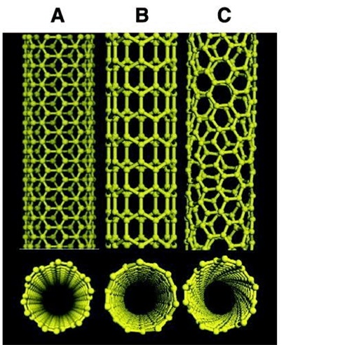 我们需要注意到,把一张纸卷成一个管子,有很多种卷法。可以粗,也可以细。可以平着卷,也可以斜着卷。不同的卷法,得到的碳纳米管性质是不一样的。其中有些是半导体,有些是导体,或者说是金属。