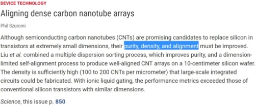 在此之前,顺排、高密度和高纯度这三个要求,没有能同时做到的。有些实验能实现高密度,但没有高纯度。有些实验是有了高纯度,而没有高密度。所以,碳纳米管晶体管的性能,总是比硅差至少一个量级。