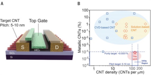 论文图1,左边是碳纳米管晶体管的示意图,右边纵轴是金属性碳纳米管比例,横轴是碳纳米管密度,注意这项工作第一次落在了金属性碳纳米管比例小于百万分之一、碳纳米管密度在100至200根每微米的有用范围内