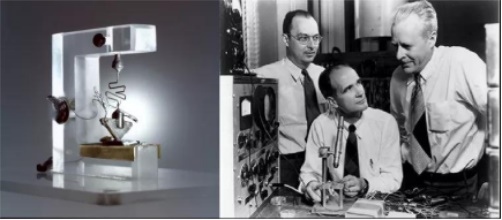 世界上第一支晶体管与晶体管的三位发明人(左:巴丁,中:肖克利,右:布拉顿)