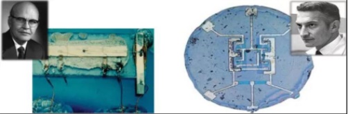 图左为基尔比与他的锗基集成电路,图右为诺伊斯与他的硅基集成电路