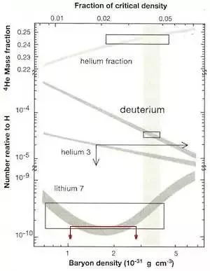 我的卡片比较了从大爆炸出发预言的各种轻元素的含量――氢、氦和锂。我们预言它们的丰度相差10个数量级,比如宇宙的25%是氦,还有100亿分之一是锂。你如果对比观测数据、也就是这里的一条细线,就会发现它们和预测完全吻合。我们从大爆炸出发对轻元素丰度的预测,和观测的结果是相吻合的。在我看来,这是说明理论正确的最有力证据。