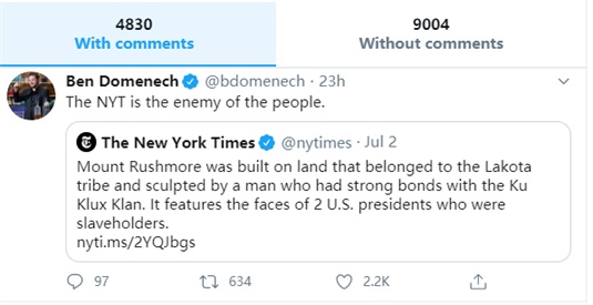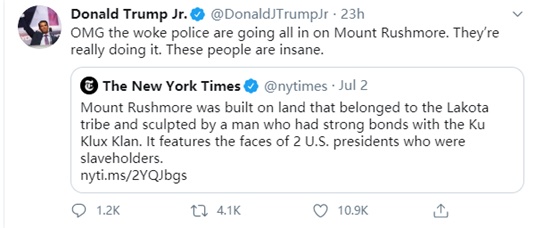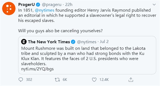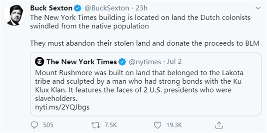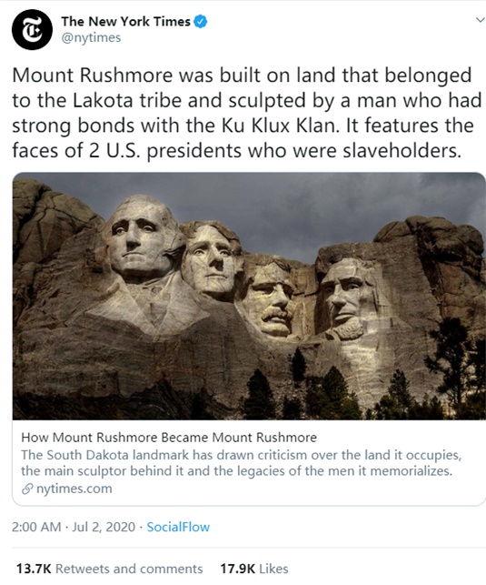 结果,当这篇文章被《纽约时报》发到了社交网络“推特”上后,尽管文章本身并没有一个字说要推倒“总统山”,这仍然令原本就已经对这场“历史清算”运动很不满的许多美国保守派白人网民、网络大V和政客瞬间“炸了锅”,纷纷怒斥起《纽约时报》来。