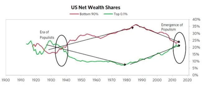 美国人均财富的分布情况。最富有的1%的人拥有的财富总量大约等于最贫穷的90%的人拥有的财富总量。这一财富分配状况与1935至1940年的情况类似。图片来源:西泽研究院