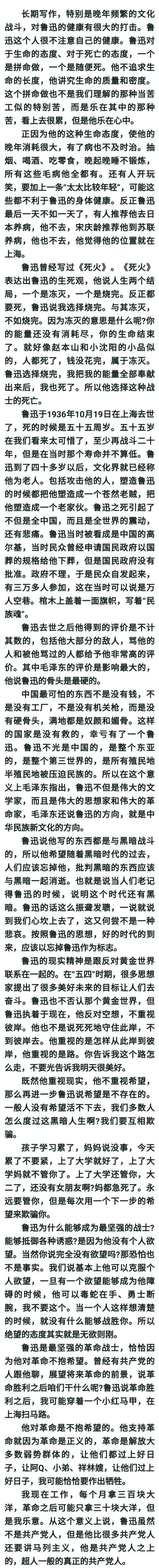 【鲁迅的晚年消耗很大,有了病也不及时治。抽烟、喝酒、吃零食,晚起晚睡不锻炼,所有这些毛病他全都有。还有人开玩笑,要加上一条“太太比较年轻”,可能这些都不利于鲁迅的身体健康。反正鲁迅最后一天不如一天了,有人推荐他去日本养病,他不去,宋庆龄推荐他到苏联养病,他也不去,他觉得他的位置就在上海。】
