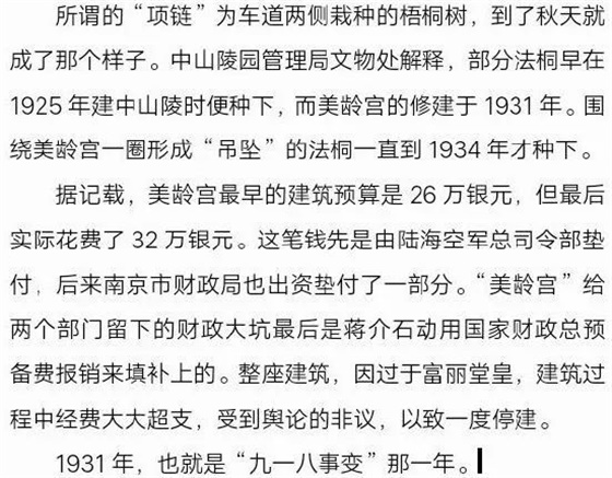 而且美龄宫修建是在九一八日军全面侵占东北、国难当头的1931年,更离谱的是挤占的是军费和政府财政支出!这个行为堪比当年慈禧太后挪用军费为自己筹办穷奢极欲的寿辰。