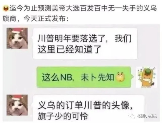 当全世界都在纳闷民调预测和专业分析不靠谱时,一张“义乌做旗子预测美国大选结果”的聊天截图,火了。