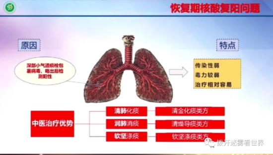尤其对于恢复期核酸复阳的问题,张伯礼指出,是没有治彻底,深部小气管内仍然有痰栓包裹着病毒,用中药化痰就可以了。