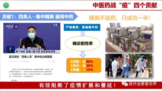隔离人员的确诊率,在2月初是80%;中药漫灌后,到2月中下降为30%,2月底下降为10%。