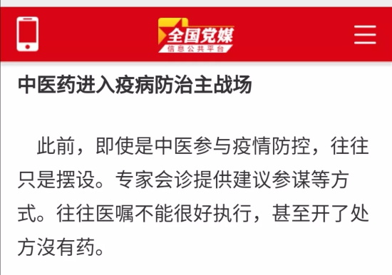 2020年新冠疫情初期,中医界很多人士就呼吁吸取非典教训,让中医药第一时间介入抗疫。