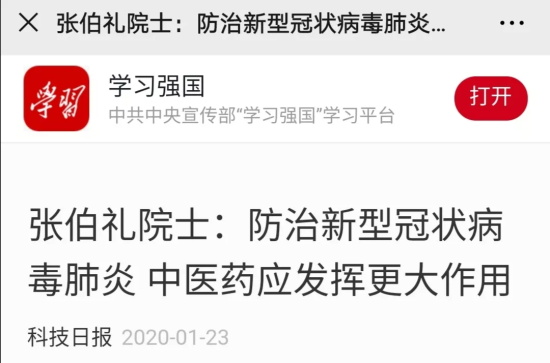1月23日,张伯礼院士呼吁:防治新型冠状病毒肺炎,中医药应发挥更大作用。