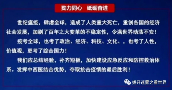 当时这个卫生组织来人,30多个人的专家队伍没有一个中医;看了40多个单位,没有一个中医单位;23000字的报告,不提中医药。 当时我非常的这个这个心里不是滋味,对新华社发发牢骚,说让我们中医心寒,新华社给改为这个非常的遗憾。 但是中央大领导看到以后批示,转天到了前线,孙春兰总理就质问他们为什么(中医)三个没有。 所以转天,又转一天,这个卫生部召开的新闻发布会,介绍中医药的经验。后来这个春兰总理在《求是》杂志上也介绍了中医药,肯定了中医药的经验,到白皮书上。 所以我们中医药应该说,这个发挥中医药的重要作用,全国人民都看到了,这个白皮书肯定了,是吧,成为历史定论了。 世纪瘟疫肆虐全球,造成人类重大死亡,重创各国的经济社会发展,加剧了百年大变革的不稳定性,令世界动荡不安。疫靠全球,也考了政治、经济、科技、文化,考了人性,价值观,更考了综合国力。 我觉得这个疫情现在已经不是简单的疫情的事儿,他整个加剧了百年大变革的不稳定性,推动了大变革的快点出现,并且加剧了它的进程,现在我们面临重大的压力,但是也是考验,同时也是机会。 我觉得我们只能是医务人员呢,管好我们自己的事,所以我们应该总结经验,补齐短板,加快建设应急反应和防控体系,发挥中西结合优势,夺取最后的胜利。 我们中医药要再接再厉啊,再铸辉煌,在可能的金秋中肯定要回来的第二波,同时可能是这个流感和新冠一起来,我们中药更要发挥作用。 谢谢大家!”