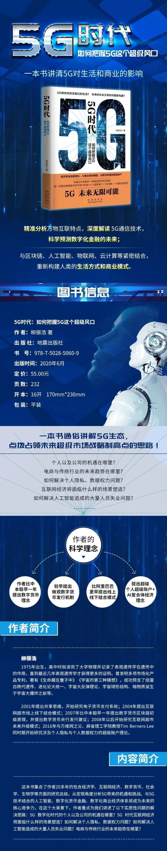 马云的这两次演讲,让我对《5G时代》一书的作者柳振浩先生更加佩服之至:作者的洞察力、对经济学与科技创新驱动的分析与预判能力,我认为可能超过了大部分科技或财经类畅销书作者。作者比中本聪先生早一年提出数字货币理念,进一步提出微观数字货币发行机制+个人超级账户+AI复合体经济,让我们能快速理解5G对我们生活的影响,以及未来社会又将如何重新构建。如果说这是一本5G时代到来之际最重要的著作,一点都不为过。