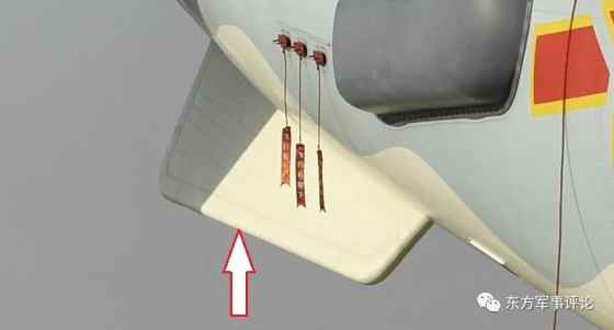 空警-500与空警-200在外形上的第三大区别,就是空警-500在尾部下方加装了两块面积较大的腹鳍。正是由于安装了腹鳍的原因,故将原来空警-200位于此处的一块刀状天线移到了前机身下方。