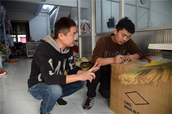 孙志国(左)在和堂哥一起整理即将发往泰国的圣诞服产品。新华社记者王凯摄