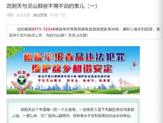 据劳德联劳局长工作的灵山县文化广电体育旅游局官微,10月17日、10月21日两次推送《武则天与灵山那些不得不说的事儿》(一)(二),讲述了武则天母亲杨氏出生于钦州灵山县武利镇,后被钦州宁氏家族收养,后随宁家迁至长安的传奇故事。