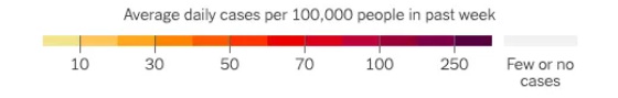 美国疫情地图:过去一周每10万人的平均每日病例数,颜色越深代表受感染人数越多 | 图片来源:纽约时报