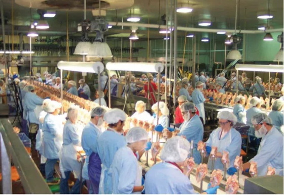 家禽工人紧挨着彼此站着,每隔2秒,就有待切割的家禽出现在他们面前的传送带上。工人们手持锋利的刀,每天重复相同的切割动作15,000次以上。美国国家职业安全与健康研究所在2013年进行的一项调查发现,南卡罗来纳州某家禽场的工人中有42%患有腕管综合症。