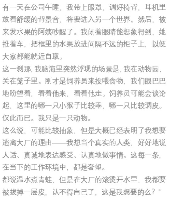 尽管逃离系统变得不可能,但像本文开头提到的那群打工人那样,能够停下来思考逃离互联网大厂也是一种进步的开端。有了这种开端,打破系统、重塑系统才能成为可能。