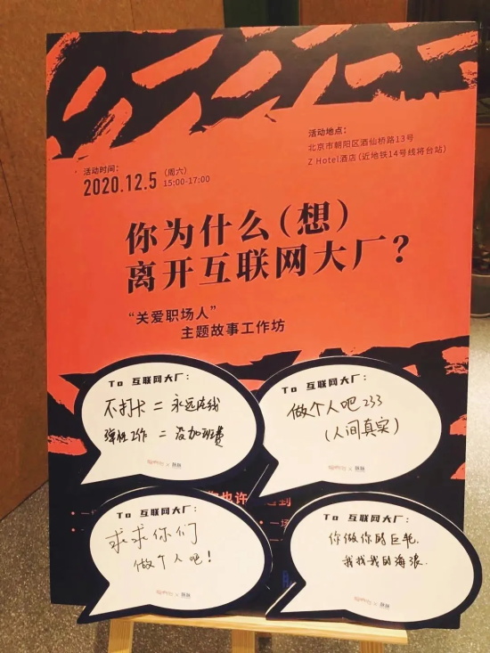 12月5日——法定周末星期六,就在很多人还在996的时候,著名的人群故事传播平台“中国三明治”联合职场社交平台脉脉联合发起了一场关于职场人的Storytelling Workshop,“你为什么(想)离开互联网大厂?”