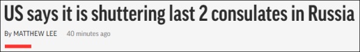 特朗普政府已通知国会,计划将关闭美国在俄罗斯仅剩的最后两处总领事馆,分别位于符拉迪沃斯托克和叶卡捷琳堡。俄方目前对此反应并不强烈。俄总统新闻秘书认为,关闭这两处总领事馆并无特殊影响,这未必会破坏本已不佳的俄美关系。