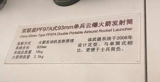 从展览馆的标牌可以看出,这种双联装火箭筒叫PF97A型火箭筒,显然是PF97的plus版本。不过这并不是国内第一款双联装火箭筒,在历史上,中国曾有过三款双管火箭筒。