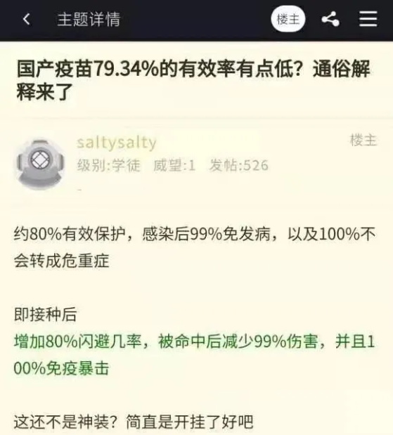 关于国产疫苗的通俗解释是,感染后99%免发病,以及100%不会转成危重症!也就是说100%能保命,要不是效果不好,欧美的有钱人脑子进水了,花几千元买走私的中国疫苗?