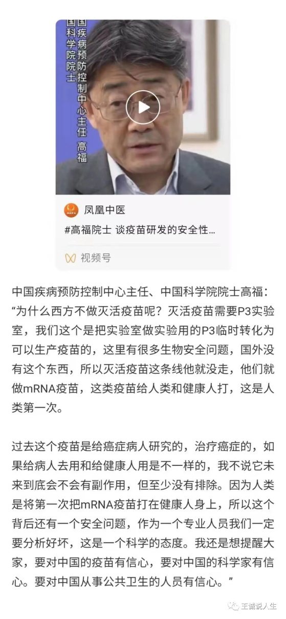 高福院士说:“为什么西方不做灭活疫苗呢?灭活疫苗需要P3实验室,我们这个是把实验室用的P3临时转化为可以生产疫苗的,这里有很多生物安全问题,国外没有这个东西,所以灭活疫苗他就没走,他们就做mRNA疫苗,这类疫苗给人类和健康人打,这是人类第一次。”
