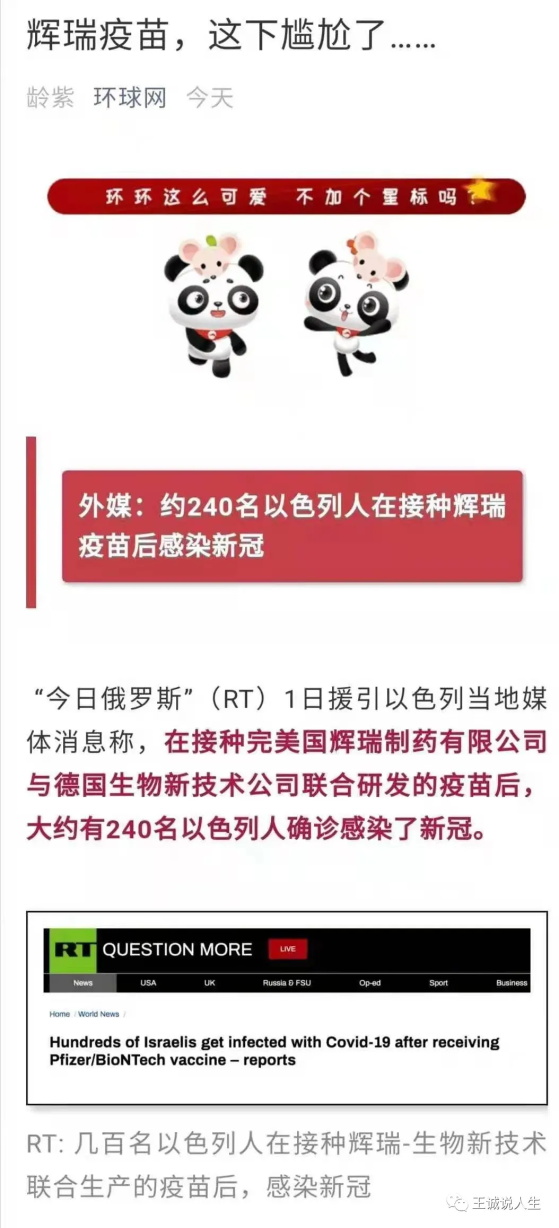 就在今天,环环还报道了辉瑞疫苗的丑事,据“今日俄罗斯”援引以色列当地媒体的报道称,在接种完美国辉瑞制药有限公司与德国生物新技术公司联合研发的疫苗后,有大约240人感染了新冠肺炎,而且其中还有4人死了!
