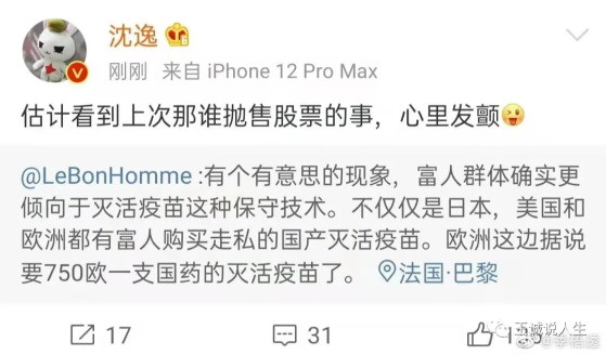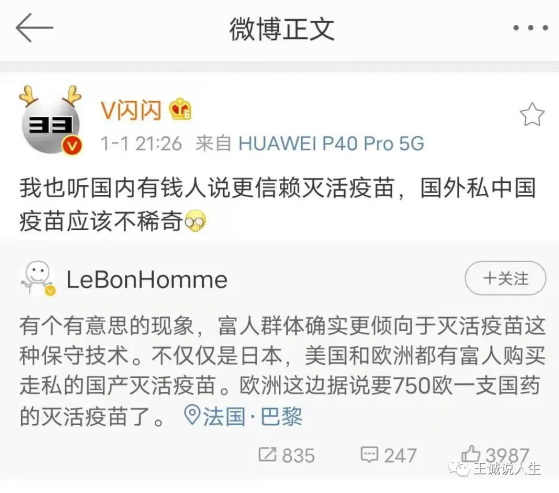 有坐标法国巴黎的博主@LeBonHomme在微博发贴说,日本和欧美的富人都偏好中国产的灭活疫苗,据说在欧洲黑市的走私国产疫苗已经卖到了750欧元一支了。他这翻话已经让我们惊呆了,毕竟国内的舆论场上长期以来都是吹捧辉瑞等外国疫苗,贬低国产疫苗。普通中国人压根想不到,我们免费就可以打的国产疫苗走私到了欧洲居然卖750欧一支。