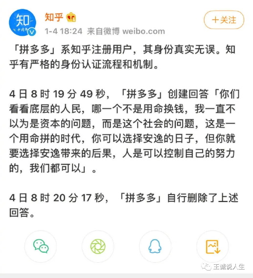 居然收到了官方认证为拼多多的用户的回答,这个回答显然辣眼睛:“你们看看底层人民,哪一个不是用命换钱,我一直不以为是资本的问题,而是这个社会的问题,这是一个用命拼的时代,你可以选择安逸的日子,但你就要选择安逸带来的后果,人是可以控制自己的努力的,我们都可以。”