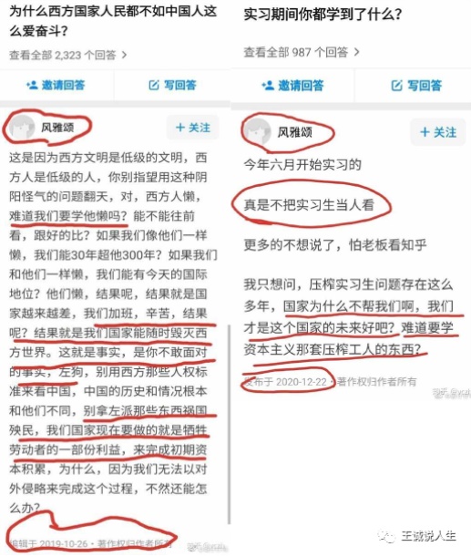 但是只等了一年多以后,当他走上了社会,被资本家毒打以后,思想就完全转变了。他的帖子里面说:“今年六月开始实习的,真是不把实习生当人看。更多的不想说了,怕老板看知乎。我只想问,压榨实习生问题存在这么多年,国家为什么不帮我们啊,我们才是这个国家的未来好吧?难道要学资本主义压榨工人的东西?”
