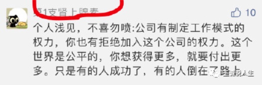 还有一些精神资本家在为拼多多辩护,有个网名第一支肾上腺素的网友留言称“个人浅见,不喜勿喷:公司有制定工作模式的权力,你也有拒绝加入这个公司的权力。这个世界是公平的,你想获得更多,就要付出更多。只是有的人成功了,有的人倒在了路上。”