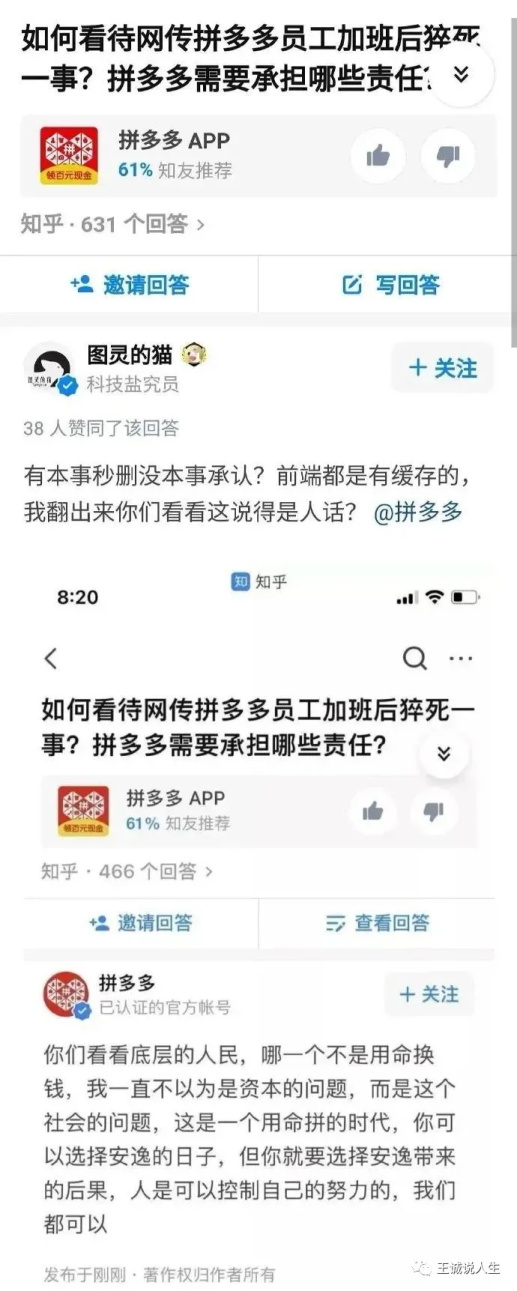 看起来头头是道,其实却是冷血无比,只不过死的人没有轮到他而已。站着说话不腰疼。我们对拼多多如此拼命压榨员工很敏感,乃是因为如果这回我们不发声,下回就可能会轮到我们。毕竟像拼多多这样的大公司都这样了,你还能期望那些小公司对员工更好吗?