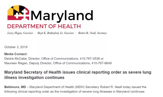 截至2019年10月3日,德特里克堡基地所在的马里兰州出现23例(仅包括自愿报告的病例)电子烟疾病病例后,该州卫生部长罗伯特·尼尔对医生发布了新的命令。