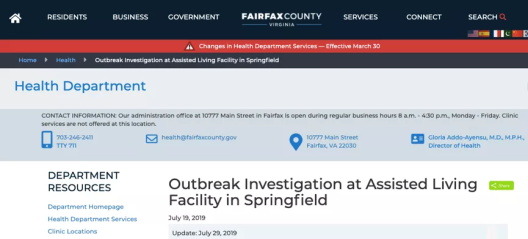 据费尔法克斯县卫生局称,2019年6月30日,“绿色春天”社区首次发现这种不明原因呼吸系统疾病的病例。截至2019年7月15日,该社区与该疾病相关的死亡病例升至3人,共计63名社区居民患病,19名工作人员也出现了症状。